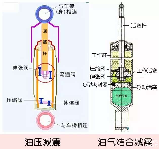 油压减震和油气混合减震很容进行区别,将减震活塞向内推或向外拉伸,能够自行复位的就是油气减震,而油压减震则无法自行回位。在实际使用中,只能依靠弹簧的弹力回位。在越野车减震中,还有一种比较常见的“氮气减震”,俗称“氮减”,其本质上是单筒式油气混合型减震。