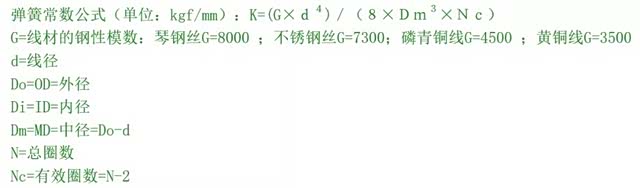 胡克定律揭示了弹簧承载能力:F=Kx,F为弹力,K为劲度系数,x为弹簧拉长的长度。劲度系数计算公式为: