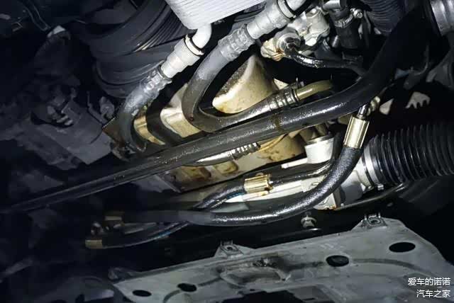 本以为泄漏的地方是某些刁钻的部位,可实际的泄漏点还是让我们颇为诧异的,其中一个与转向助力泵连接的油管螺丝松掉了。液压助力系统里的转向助力油都有不小的压力,这里松动一有缺口,不能形成密闭系统,油液自然也就夺门而出。