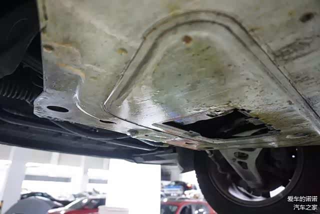 回到这台325i,不知道是不是去寻找过“远方”,油底壳也被磕了个大坑,几乎快要破裂。不过看这个样子不像是行驶中被划出来的,倒更像是被什么东西从下方顶凹进去的。