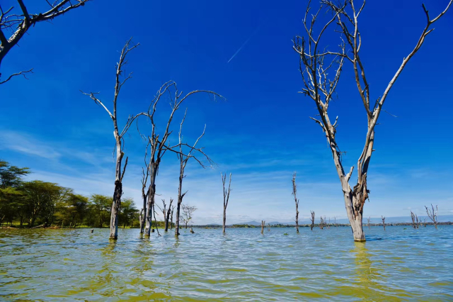 到底是什么原因使这里的火烈鸟数量急剧极少?似乎科学家们至今尚未找到准确答案,但通常认为这和距离纳库鲁湖不到十公里的纳库鲁市人口急剧增加(目前纳库鲁市人口达到150万的肯尼亚第四大城市)而造成的污染(污水直接排入纳库鲁湖),近几年降水量较大造成湖面升高湖水被稀释等原因有关。纳库鲁湖水上涨造成的枯树。