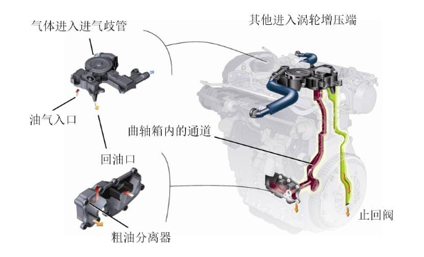 曲轴箱内的气体富含机油蒸汽和燃烧废气,所以不能直接排放到大气中,必须在分离机油蒸汽后再次进入气缸内燃烧。