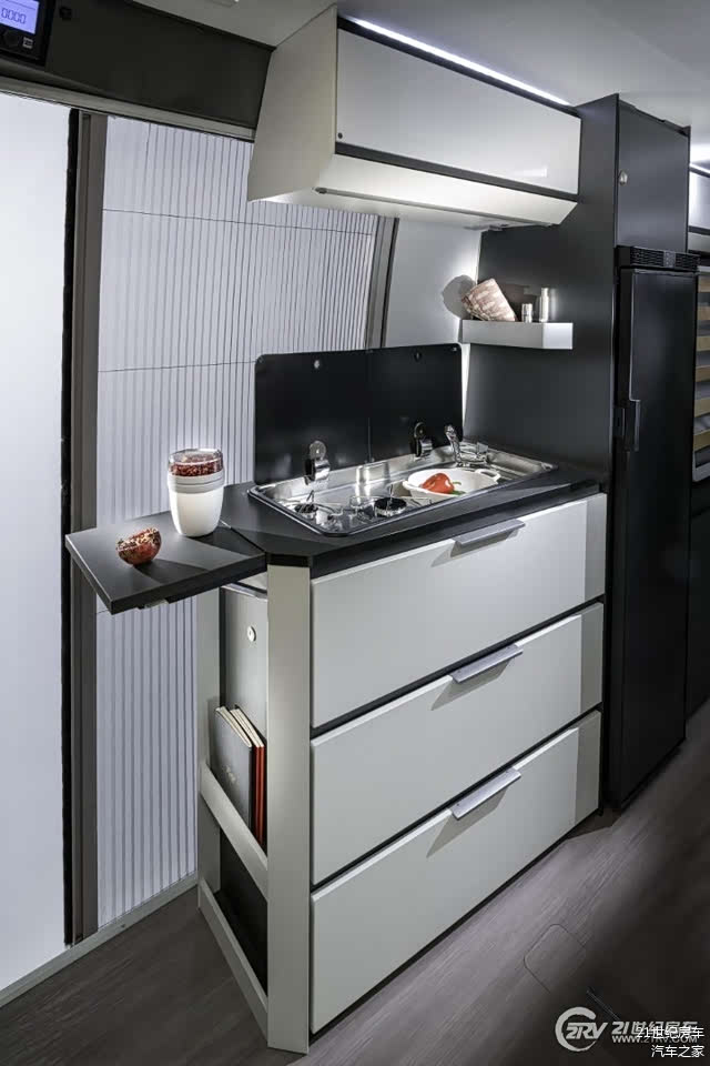 这款露营车采用了一款叫做Sporthome的套件,把后床下面变成一个比较大的仓库,平时车尾只是作为一张拼接双人床使用,下面的仓库作为户外装备的储藏室使用。室内的设备铺陈十分简单,没有卫生间,但是有一款厨房,厨房包括一个三芯燃气灶、烤箱和90升冰箱。Sporthome仓库套件需要选装,加装之后的基本价格是54995英镑(约合人民币47.9万元)。