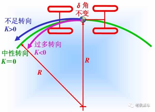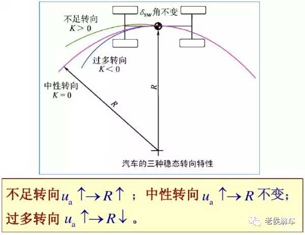 当汽车的转向盘转到一个固定的转角后保持不动,改变汽车的行驶速度,此时汽车的转向半径与理论转向半径相比较,可能会出现三种情况: