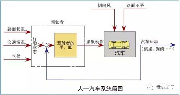 驾驶员-汽车系统是一个闭环控制系统:在汽车行驶过程中,驾驶员根据需要,操纵转向盘使汽车做转向运动。路面的凹凸不平、侧风、偏载等影响汽车的行驶。驾驶员根据道路、交通等情况,通过眼、手及身体感知的汽车运动状况(输出参数),经过头脑的分析、判断(反馈),修正其对转向盘的操纵。如此不断地反复循环,操纵汽车行驶前进。