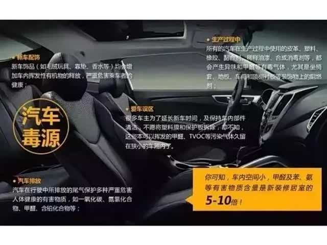 新车的气味主要来源于如仪表盘等塑料件、地毯、车顶毡、橡胶、皮革、涂料等物件。有毒的物质还有来自于粘合剂所挥发的物质,从而使得车内甲醛、甲苯、二甲苯、甲醇等化学污染物开始增多,这些物质中对人体危害最大的则要数甲醛了。