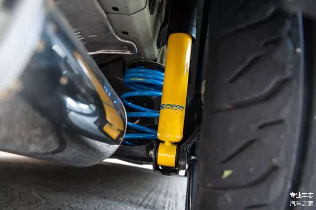 在避震器方面,GK5也是用上SPOON的产品,是一套原厂形式的避震器,但吸震力跟缓冲力比原装要强得多,适合较为激进的走行方式,弹簧配用则与一般的飞度产品不同,原有SPOON配用在GK5身上的为前2.5K后2.4K,但这台K20A GK5则是前6K后5K,比一般GK5用的硬得多,所以行驶起来也较为硬朗。