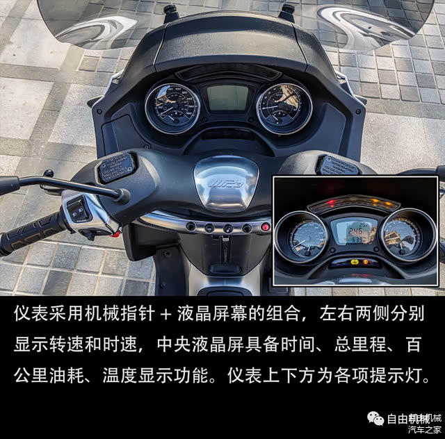 动力方面,MP3 500是贱贱目前试驾过的排量最大的倒三轮车型,在城市中已经足够你任意使用。整个动力输出集中在低转速域,虽然MP3 500的湿重已经达到270kg,加上驾驶者65kg的体重让它已经有了接近七百斤的重量,但是依旧没有感觉到动力的迟滞。