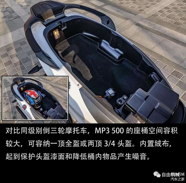 这里贱贱有一点要强烈吐槽:由于MP3 500的坐垫角度略微前倾,同时双腿无法向前伸展,在进行急刹时,整个身体会随着惯性突然甩向前方,在没有防备的情况下不免让人有些心悸。不过贱贱还在MP3 500的车头对应膝盖的位置发现了两处软质皮革,可能比亚乔也考虑到这个因素,防止车辆对人身造成伤害吧。
