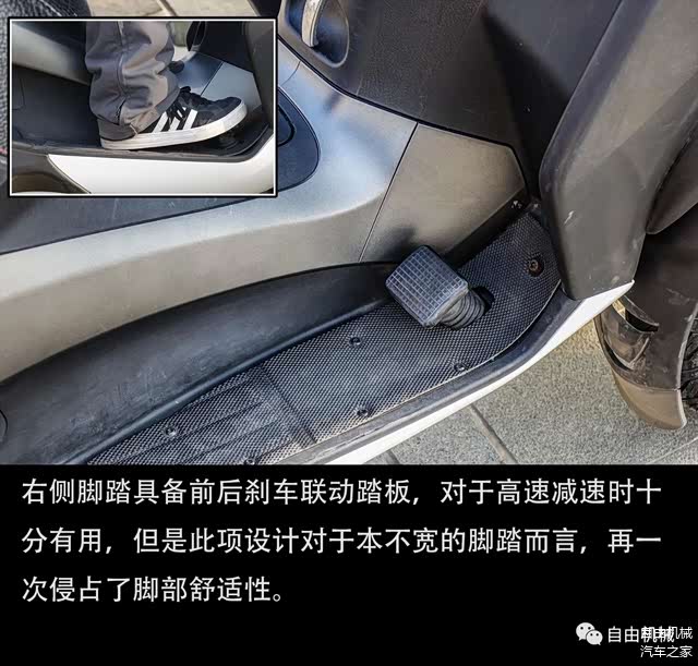 而且在使用联动刹车踏板的时候,也并没有感觉到ABS的工作,这也可能是刹车踏板的制动力度还不足以让轮胎抱死的缘故。
