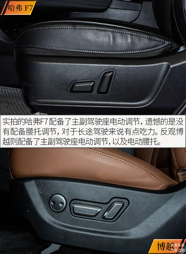 哈弗F7在车身长度以及轴距上都要大于博越,因此在空间上具有一定优势。与此同时,两车的座椅都走的是偏向舒适的路线,座垫宽大,填充物柔软。另外,在后排表现上,博越出乎意料的还配有了后排老板键,对于后排乘客调节腿部空间有较大帮助。