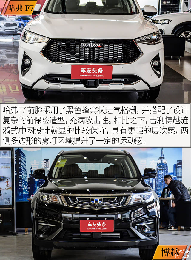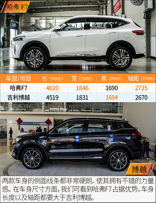 身为一位90后的我,不得不说我更加喜爱哈弗F7的内外设计风格。哈弗F7的外观相比博越来的更加战斗,并且在车身尺寸上也占有优势,看上去更加具有气势。而在内饰方面,哈弗F7倾向驾驶员一侧的中控设计更加符合其运动气质,而博越大面积的银色面板有点略显老气,应该更加适合比较成熟稳重的消费者喜爱。另外,在配置层面,两车的表现都非常出色,完全能够满足年轻消费者对于科技配置的追求以及应付日常使用。最后来看到动力部分,其中哈弗F7的动力总成明显在账面数据上更有优势。多插一句,吉利目前正在处于技术高速发展的阶段,其旗下的车型技术更新迭代越来越快,显然目前这款博越的整体动力单元还是吉利老旧的技术,相信不久后博越也会迎来技术上的更新换代。因此这次对比的结果显而易见,我更加推荐哈弗F7,而就博越而言,期待它早日迎来换挡。(文/车友头条 张祁有)