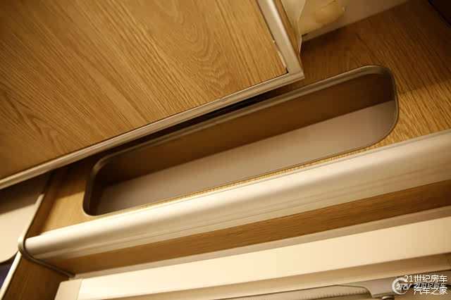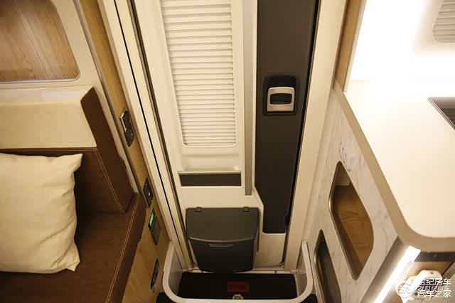 乘客门采用HARTAL双点锁的房车专用门,带有保温特性,搭配三明治保温车箱可保持房车内部的温度。乘客门上方带有遮光帘,中间有一处储物空间。