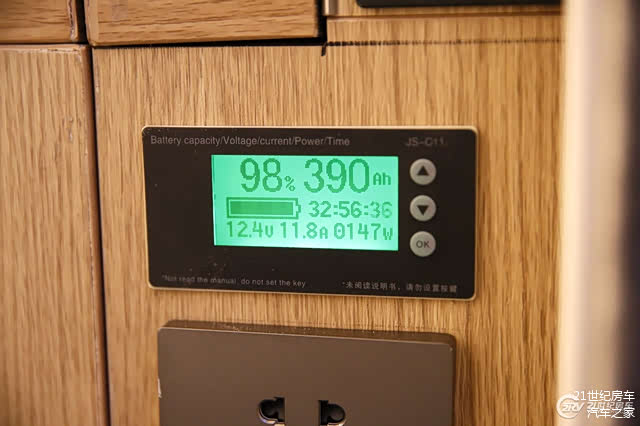 科斯这款房车配备纽福克斯3000W逆变器,下方为电瓶监控器以及220V电源插座。
