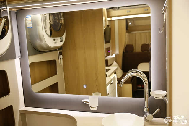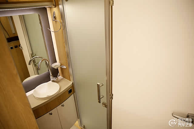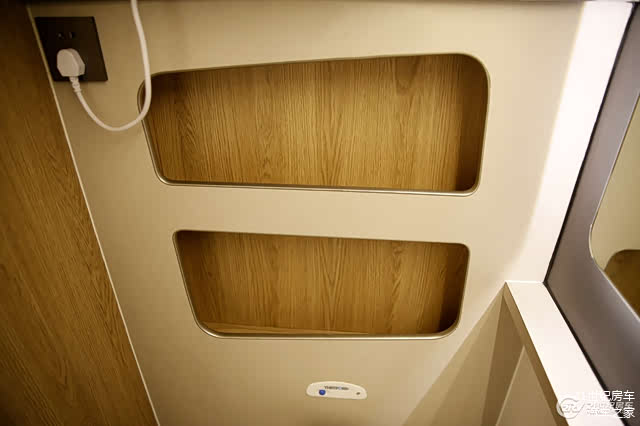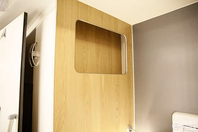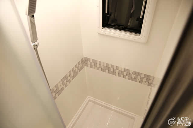 淋浴喷头采用独立式设计,更接近家中的淋浴感受。侧面带有方形外推窗,隐私帘也同样没有缺失。车顶有顶置柜,方便放置更换的衣物以及淋浴物品。