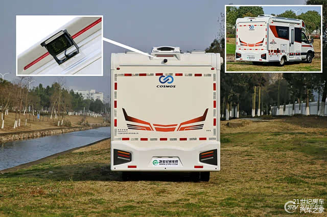 车尾布置简洁,车顶可以看到意大利Telair驻车空调室外机,以及300W太阳能电池板;尾部装有倒车雷达以及倒车影像,保证车辆后部的安全。