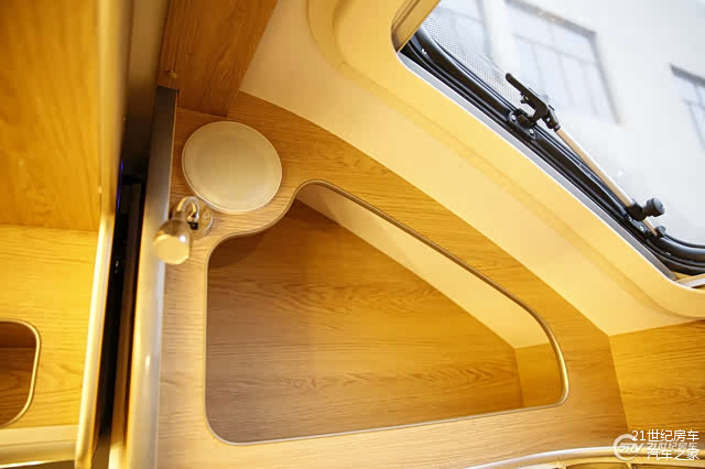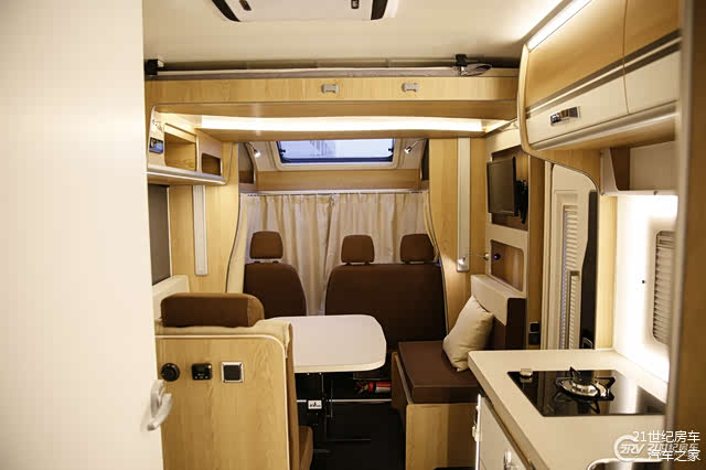 来到科斯沙漠玫瑰的车内,可以看到车厢生活区与C型房车的常规布置不同,会客区与厨房区为常规设计,车尾尾床部分在该款车型上被布置为整体式卫生间区域。