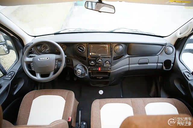 依维柯欧胜的驾驶舱布局与家用车很相似,档次感进一步得到了提升,在细节方面最大程度的保留了原厂设计,更加简洁。前排座椅可乘坐3人。动力方面搭载一台3.0T涡轮增压柴油发动机,最大功率146马力,峰值扭矩370牛米,发动机满足国5排放标准。变速箱方面有6速手挡及8AT自动挡可供选择。中控大屏部分可实现导航功能,同时也可显示倒车时的影像。