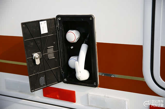 市电接口及注水口为房车的基础配置,在能接电的地方可连接220V市电为房车供电,方便使用大功率电器。通过注水口可为净水箱补充生活用水,净水箱容积为140升。