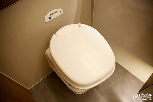 马桶为赛特福德品牌,采用可旋转设计,墙壁侧蓝色为冲水按钮,右侧带有黑水箱容积指示灯,在将满时会进行提示,方便及时倒出。