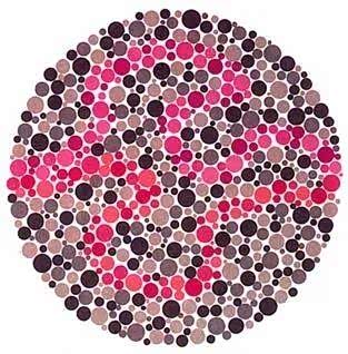 图一,这张图在色盲检测中是很常见的,图中有两种颜色的线粒,红色盲患者只能看到紫色线,而绿色盲则只能看到图中的红色线,全色弱和正常视觉者,则两条线都能看到。