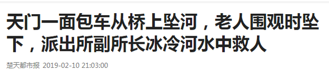 除此之外,还有另外几起坠河事件,2月9日上午,天门市净潭大桥上,一辆面包车因为桥面结冰打滑,撞毁大桥护栏后坠入天门河中,桥上一名围观老人随后也坠入河中。