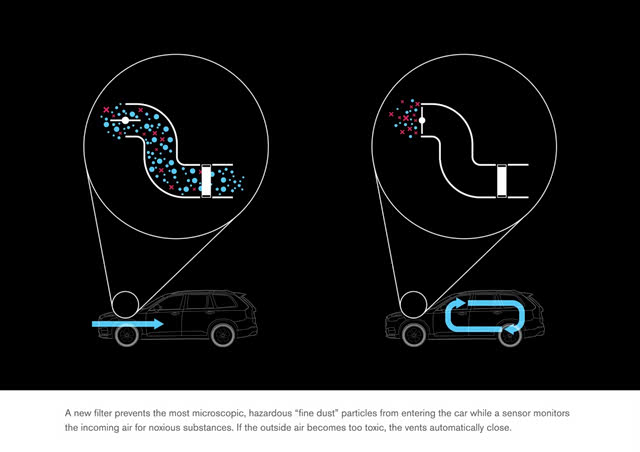 在翻阅相关资料的时候,我发现沃尔沃清洁驾驶舱的工作原理并不复杂,并且与很多汽车品牌的清洁空调系统的作动机制类似。但是,它绝对不仅仅是一个清洁空调系统那么简单,实际上Clean Zone应该被理解成一个净化技术的集成概念,通过以下软硬件系统组成,包括: