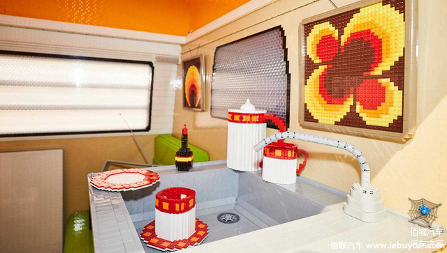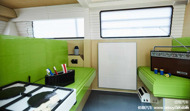 栩栩如生的细节还包括推拉门,进入车舱内,可以看到明亮的绿色座椅和橙色车顶。里面的所有的配件,比如收音机和餐具等,也都是由乐高积木拼装而成。