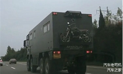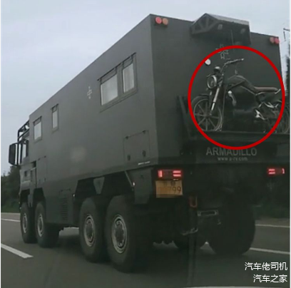 这样一辆价值1268万元的奔驰乌尼莫克6X6出现在国道。这辆车有6米多长,挂着黄牌,但是车尾的机车比汽车还贵。这是一辆价值超过10万元的本田摩托车挂在奔驰车的后面。