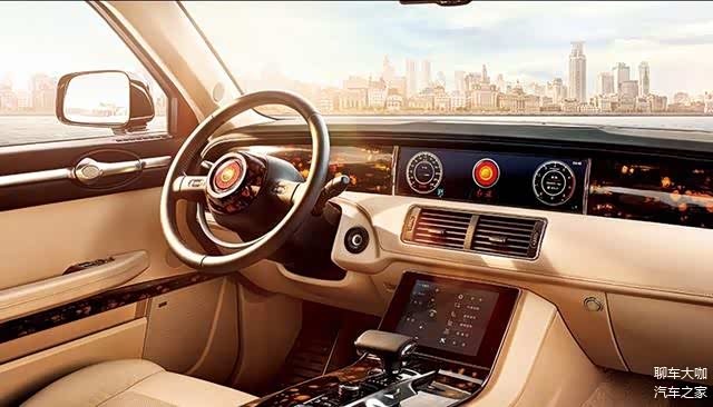 车内也看不到过多的按键,而且采用了时下最为流行的连屏设计,集成了仪表和娱乐系统,看上去非常的简洁。方向盘和轮标太阳花标志很亮眼,都是纯金手工打造的。