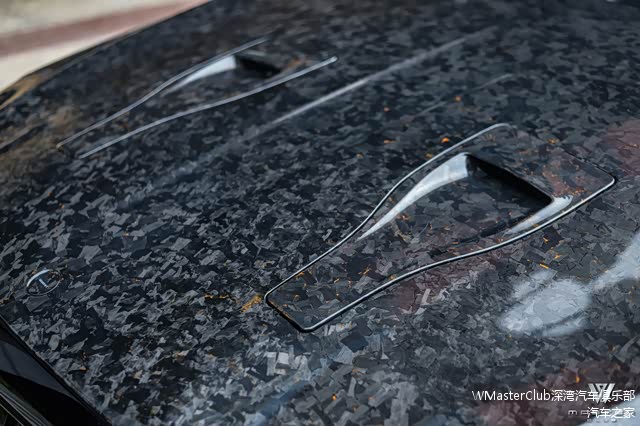 整个锻造碳纤引擎盖表面十分光滑,没有一丝瑕疵。引擎盖上的“黄金丝”看起来十分特别。