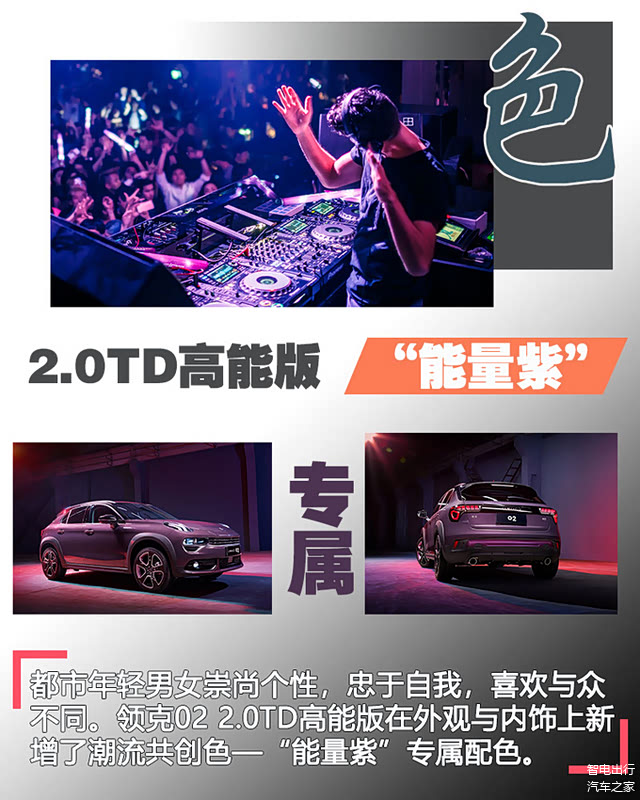 领克02 2.0TD高能版在外观与内饰上新增了潮流共创色—“能量紫”专属配色,不过遗憾的是,我并没能够分配到新配色的车辆,好在还有一台颜色更加抢眼的车型。