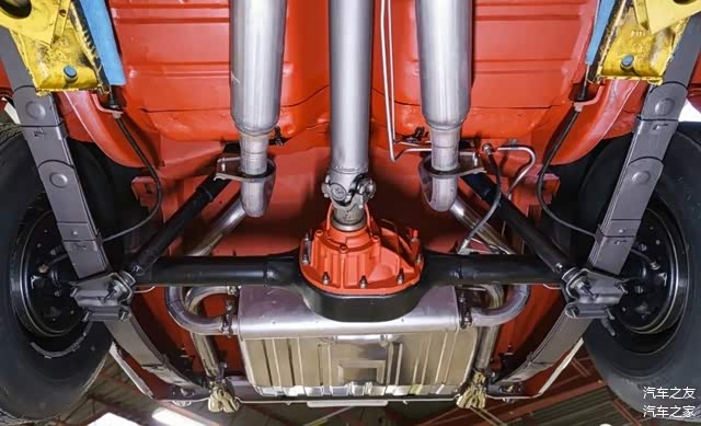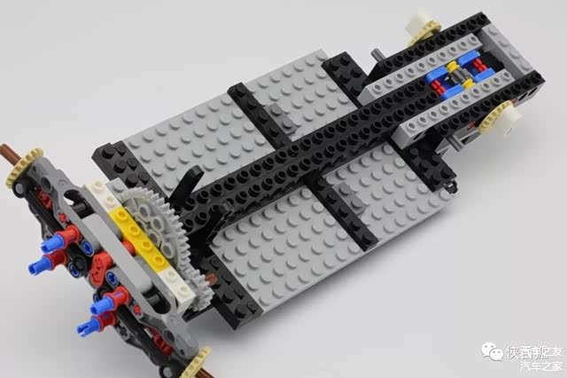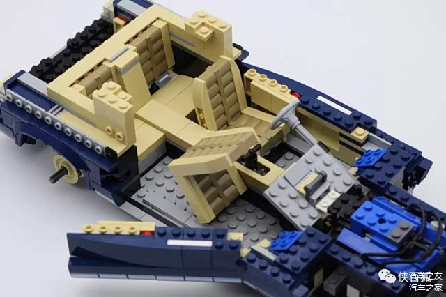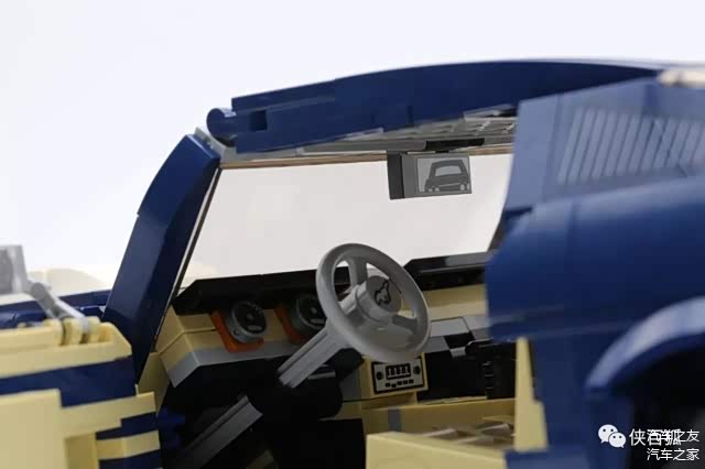Ford Mustang属于经典的前置后驱平台,套装车辆底盘中部使用了孔砖搭建一条从发动机舱到后轮的中部隆起结构,以暗示真车之中将动力从发动机传到后轮的传动轴,虽然这里面并没有如Technic科技系列一般真的藏了一根传动轴,但是能想到并搭建出这一点已经很赞了。