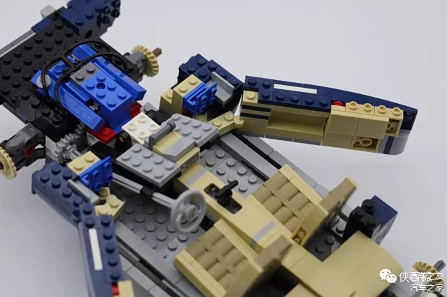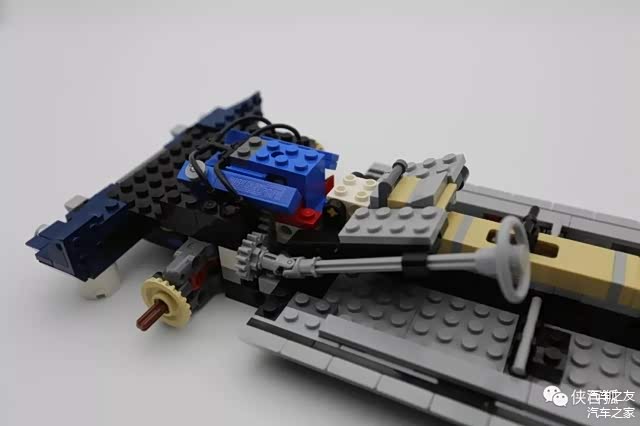 另外一个细节是巧妙地使用了1 x 2 with Arm Up的零件,让原本因为单位体积无法固定的斜臂完美重现了真车之上的平衡拉杆,并且恰恰好固定在前轮的避震塔顶处。看来勾股定律Mike已经牢记在心了,这可是对所有玩家赤裸裸的炫技啊!