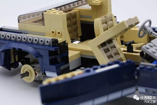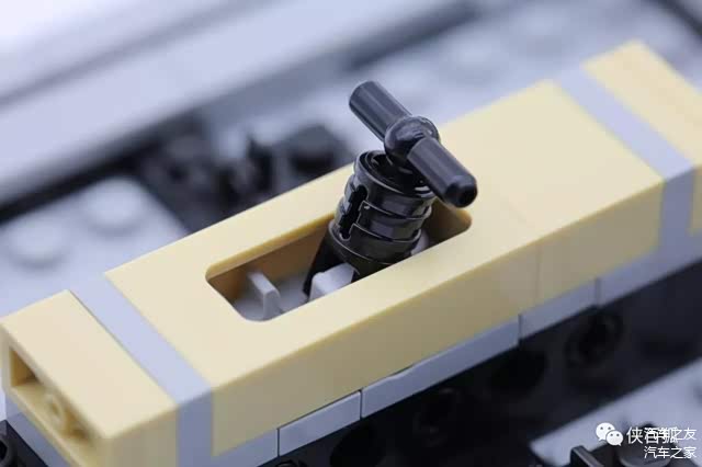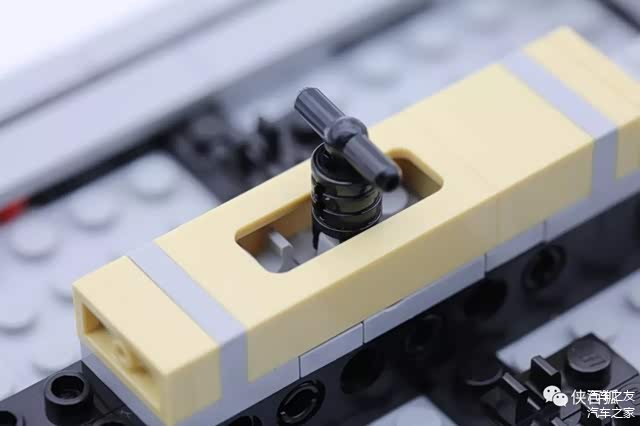 地台中部那让不少人认为是手刹的拨杆其实还原的是,由著名变速箱企业博格华纳齿轮部门所设计打造的“Ford-O-Matic”变速挡把,这台变速箱也是福特公司第一款广泛使用的自动变速箱,Mike巧妙利用Hinge Cylinder 1 x 2 Locking零件可多角度拨动的特性,形象生动地还原了这套3档自动变速箱的各个不同操作阶段。