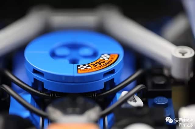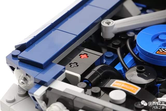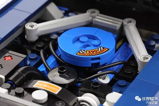 发动机舱的还原算是一大亮点。麻雀虽小但五脏俱全的舱内不但有一台与原车一样的蓝色390型V8发动机,发动机缸体贴有“Power By Ford”的福特商标,以及代表机油灌注口的Mustang标志印刷件,还有诸如带有水箱盖并贴有“小心风扇”的散热水箱、,贴有390贴纸的大圆盘空气滤清器等等,就连位于发动机舱边上的汽车电瓶都极有心思的采用红黑两色十字栓模拟出电瓶的正负极,倘若负极能是“-”号就更完美了,不过统观现在LEGO的零件库,貌似除了使用人仔的小锤子以外,还真的找不出其他替换方案了,而且就算用了小锤子也会影响整体效果甚至因为高出半个单位而让车头盖不能放下。