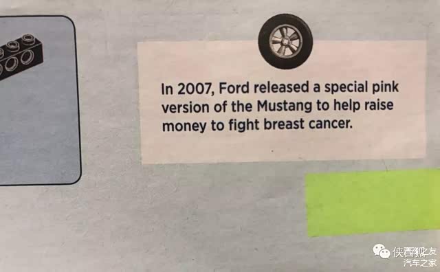 有意思的是,在搭建手册的分页之中,不经意之间总能发现关于Ford Mustang的各个历史节点重要事件。比如2007年,福特发布了一款特别的“粉红色勇士”Mustang,许多主要内饰件以及车身侧标均以粉红色涂装旨在筹集资金以对抗乳腺癌,并将善款捐赠给Susan G. Komen苏珊科曼乳腺癌基金会。这波操作广受称赞并延续至今,目前凑集资金已达1.33亿美元。