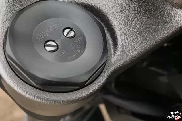 CB1000R避震器由日本Showa(昭和)出品,其前避震搭载了SFF-BP技术,通过顶部调节旋钮便可看出,左侧前叉负责压缩阻尼和回弹阻尼调节,右侧负责弹簧预压调节,性能更加且重量更轻。BP则代表Big Piston大活塞,阻尼阀体活塞直径更大,提升避震器响应速度。