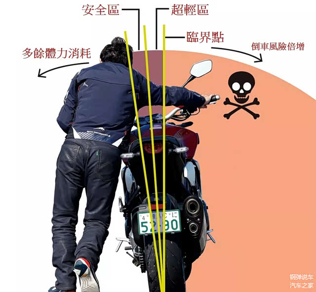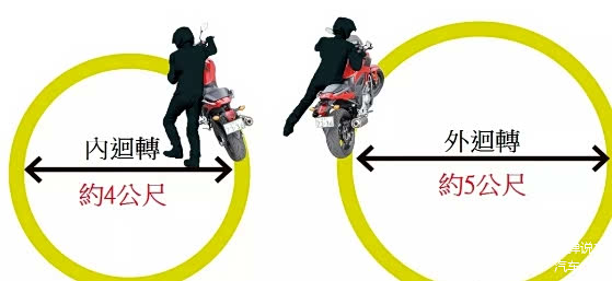人与车形成一个人字形,这样支撑点不错,也可以平衡车身。这就是一个合理的安全范围。摩托车与人之间相互支撑达到平衡。左右摆动的半径为1米的样子,人站在左边时,向左转与向右转回转的半径为1米。掌控好了就不会出现摔车情况。