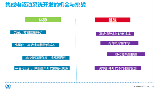采埃孚集团电驱动事业部跨系统集成业务单元亚太区负责人王岳总结了电驱动系统集成化的优势和挑战,如下图所示。集成化的电驱动桥实现了驱动电机、功率控制器、变速器、差速器等部件的全面集成,成本更低、体积更小、效率更高,适用于不同平台的设计和应用,为车辆节省大量空间。当然,集成化的电驱动桥也面临很多挑战,比如高转速带来的NVH问题、冷却难题、功能安全问题、EMC复杂性提高、跨零部件开发协同难度增加等。