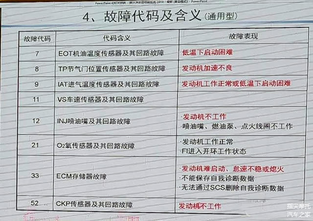 需要说明的是:FI灯提示的故障码,是因故障而产生,并精确指示故障部位,在消除故障码之前,一定要先排除故障,否则即使清除了,下一次启动后,故障发生,故障码即会重新产生的。千万不要以为清除了故障码就是排除了故障,这是个误区!