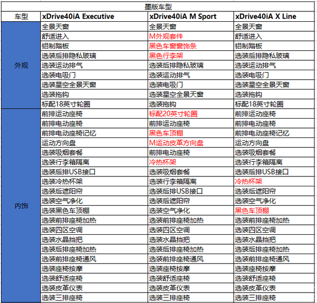 图片中依次往下分别是 xDrive40iA Executive,xDrive40iA M Sport,xDrive40iA X Line。三款车型在外观上,除了xDrive40iA M Sport相比其它两款车型多了M运动外观套件,此外,另外两款整体外观上没有什么区别,仅仅是在细节处有不同变化。X Line版本前雾灯下面采用了倒“L”型的镀铬装饰件,在四门的车窗框架位置采用了高亮黑色面板,而xDrive40iA Executive则是普通的黑色面板。具体其他配置请看下表: