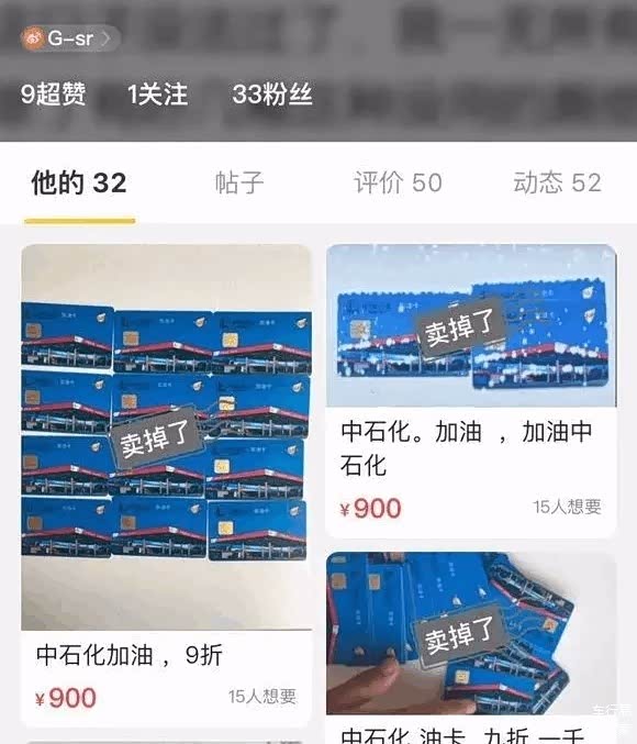 中石化的九折卡,900元买1000元!卖家如约发货,收获确认卡里确实有一千,确认收货完成好评,这时候剧情开始。你拿到的是副卡,主卡可以随时停用副卡,并冻结里面的油费,油卡在你加了一两次油后被停用!你开始联系所谓的卖家和售后,他们会告诉你他们也不知道什么情况,收卡的人下周回来,让你等!到后面再应付你几次,人家又把你拉黑,销声匿迹。