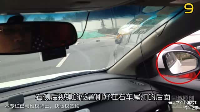 在车内我们再注意观察右侧后视镜的位置刚好在右车尾灯的后面,