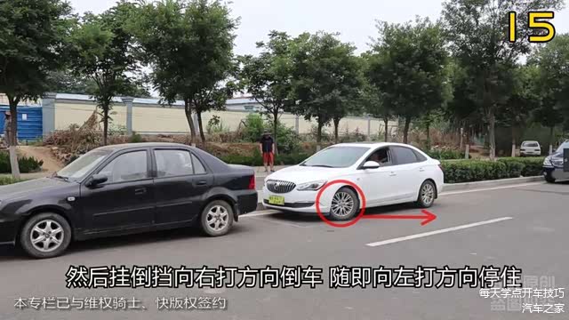 也就是说在看到这个位置的时候向左打满方向倒车不会发生刮蹭。下面我来试一下。