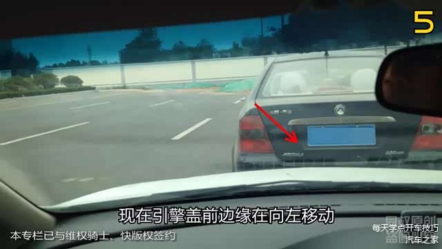 车头在向左划弧线的时候,你注意观察你能看到的前车最低位置的变化,现在引擎盖前边缘在向左移动,
