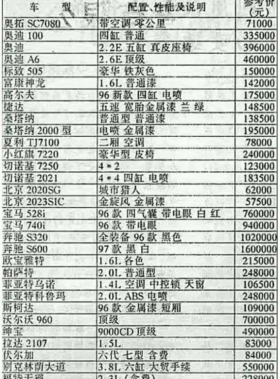 虽说国内汽车市场发展时间不长,但少说也有几十年了,在这几十年里,汽车也只都是备受争议的对象,在过去,汽车就是一种身份的象征,只有权贵大款才有资金有能力买车,直至今日,汽车开始趋向平民化,一个普通人都能够买车。但自从小编看了这份1996年的购车价目表之后才发现,原来这23年过去了,我还是买不起车!