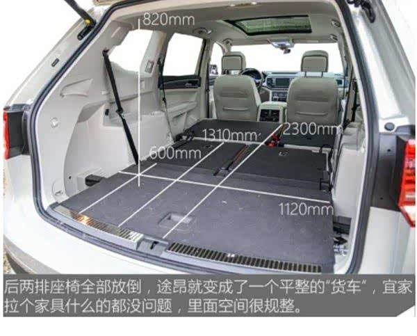 第5款、途昂,定位于中大型SUV,支持第二三排座椅全平放倒,但是美中不足的就是后排座椅只能使用手动放倒,像福特的探险者等同类型SUV大多支持电动折叠。放倒后可以用于长途旅行睡觉使用,空间表现也是非常满意的。