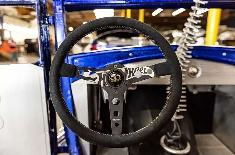 三辐式的骨架上以雷射雕刻的方式雕出了风火轮的商标,喇叭盖也有着50周年的图样,彰显出这款限量方向盘的独特之处!