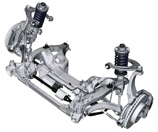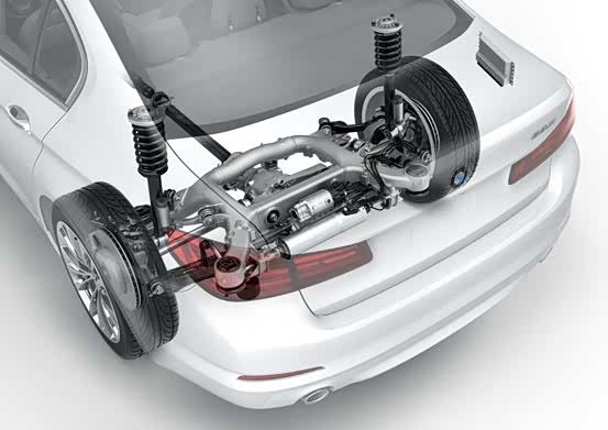 而宝马G30 5系,G11 7系等中大型车型的前悬架则采用刚性更强的双A臂结构,后悬架副车架则采用成本更高的铝合金制造,后悬架摆臂也更多的使用铝合金材质。